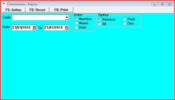 This screens allows for selections related to commissions. The user can select pending commissions, balance of