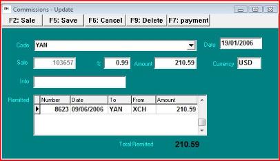 The update screen for Commissions allows to check and edit a given commission. The Remitted grid is visible only if
