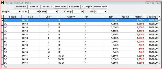 The Price Book for polished is a matrix with price points that allows for automating pricing along industry standards when adding diamonds to